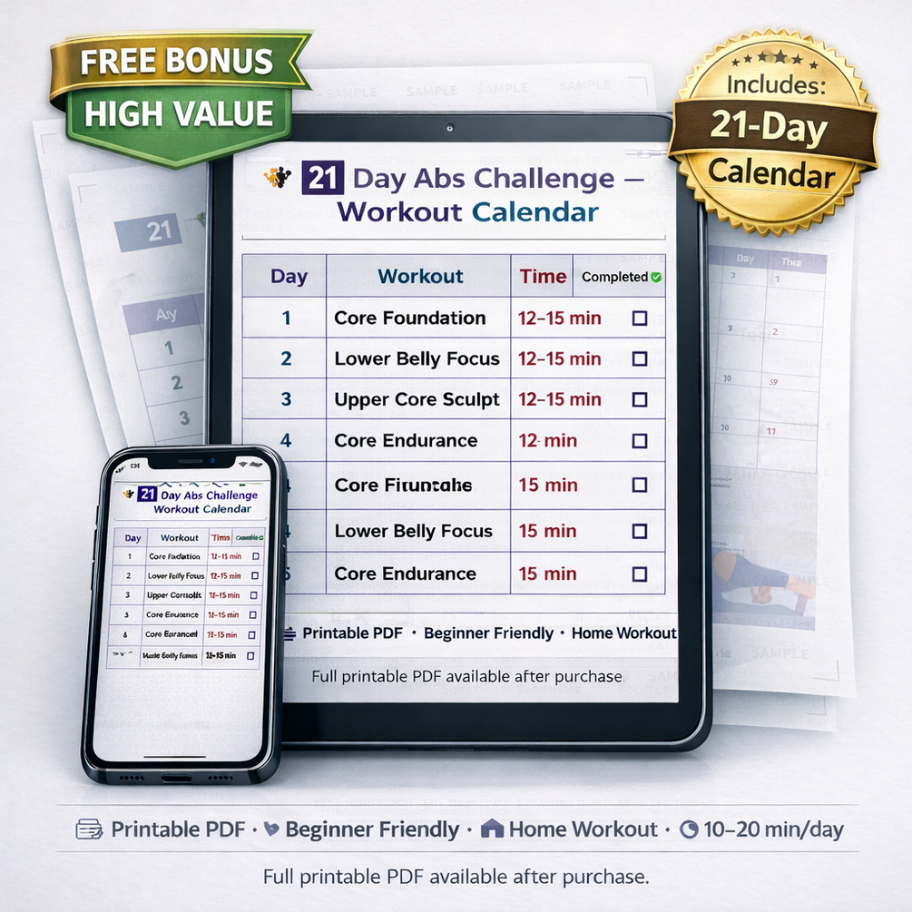 This 21 Day Abs Challenge is designed for real people with busy schedules who want visible progress through short, structured, home-based workouts.