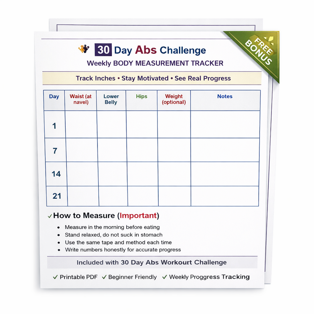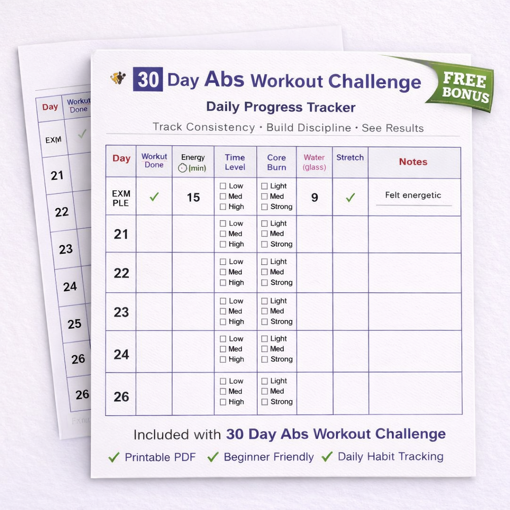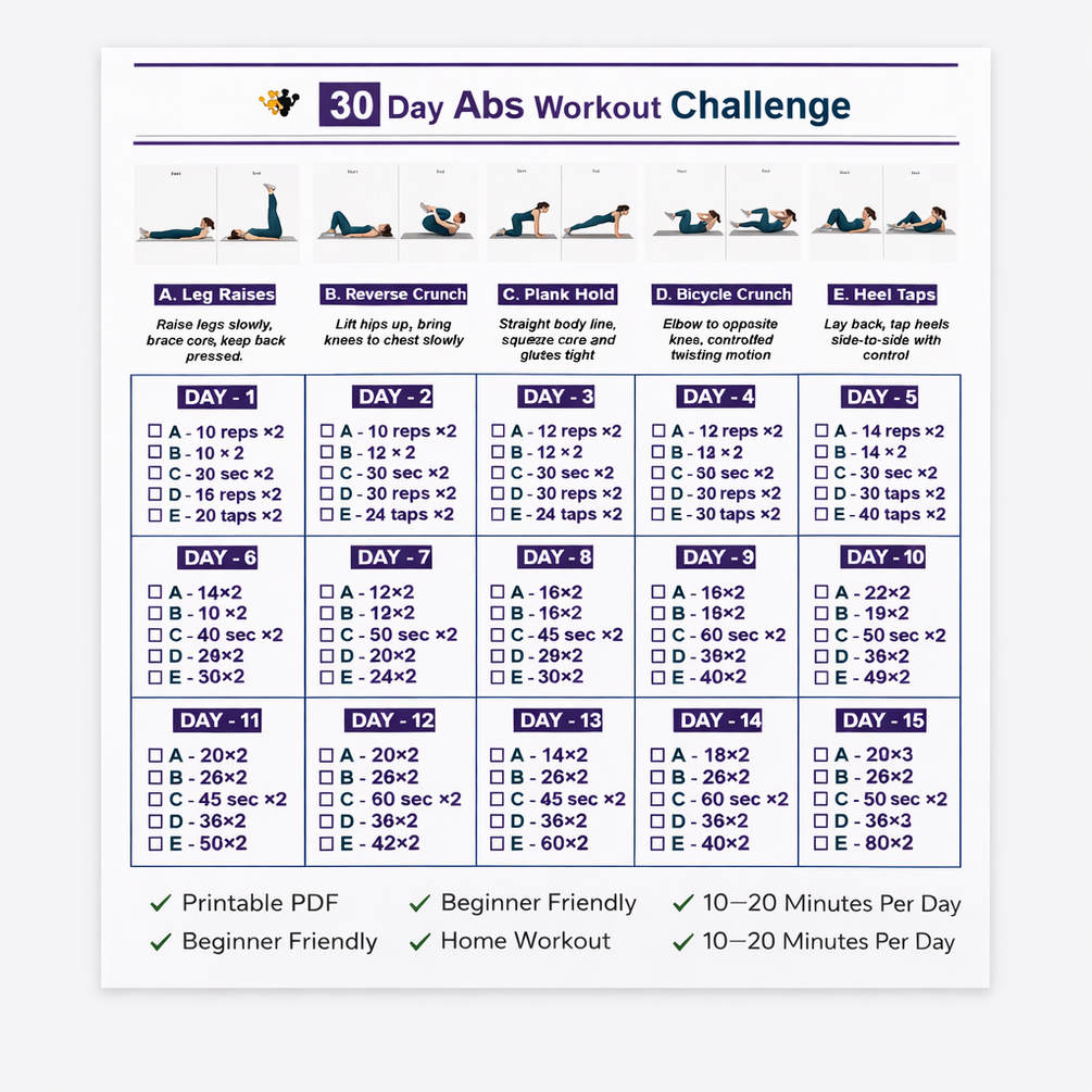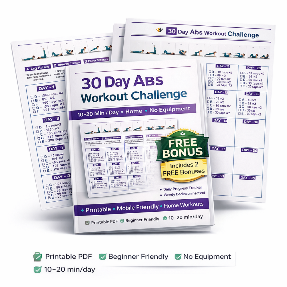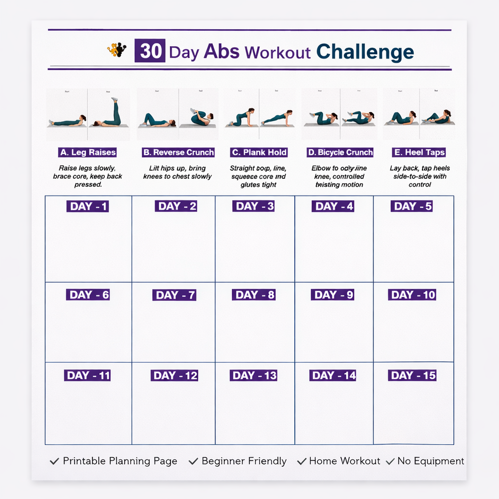 The 30 Day Abs Workout Challenge is a simple, structured, beginner-friendly abs program designed to help you build a strong core and flatter stomach at home.