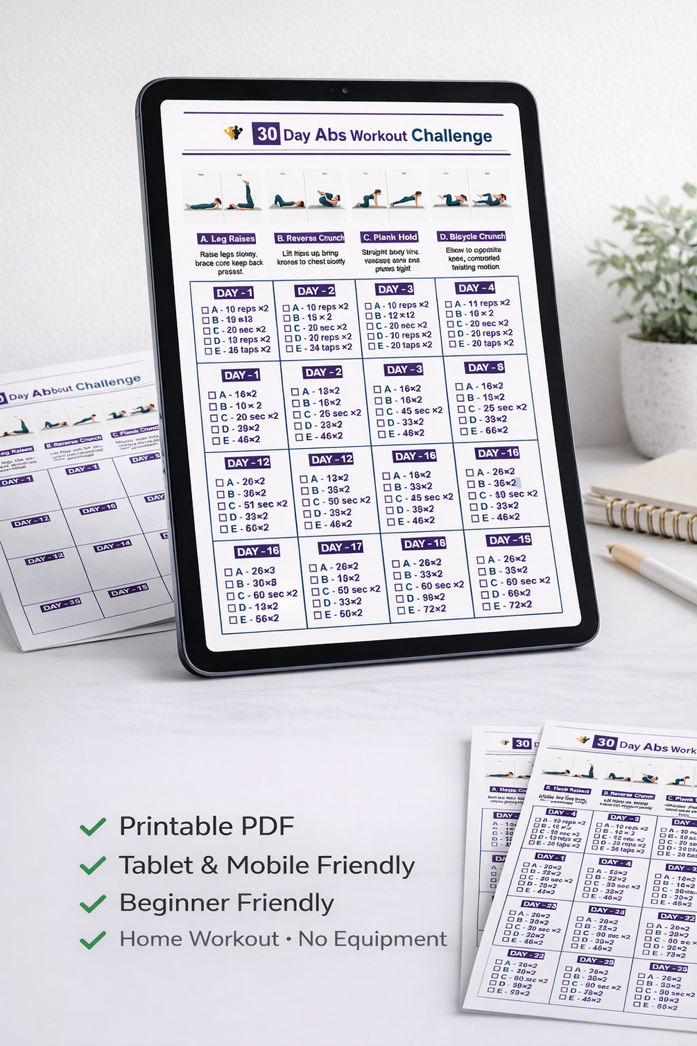Each day tells you exactly what to do, with clear exercises, reps, sets, and time, all laid out on one easy-to-follow printable page.