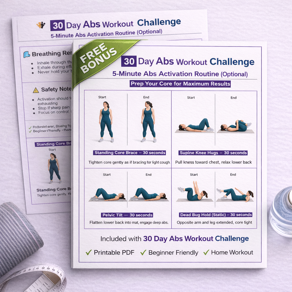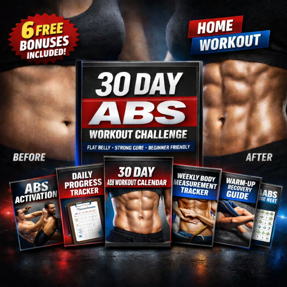 The 30 Day Abs Workout Challenge is a beginner-friendly, home workout program designed to help you build a strong core, improve posture, and flatten your stomach — without gym equipment or long workouts.