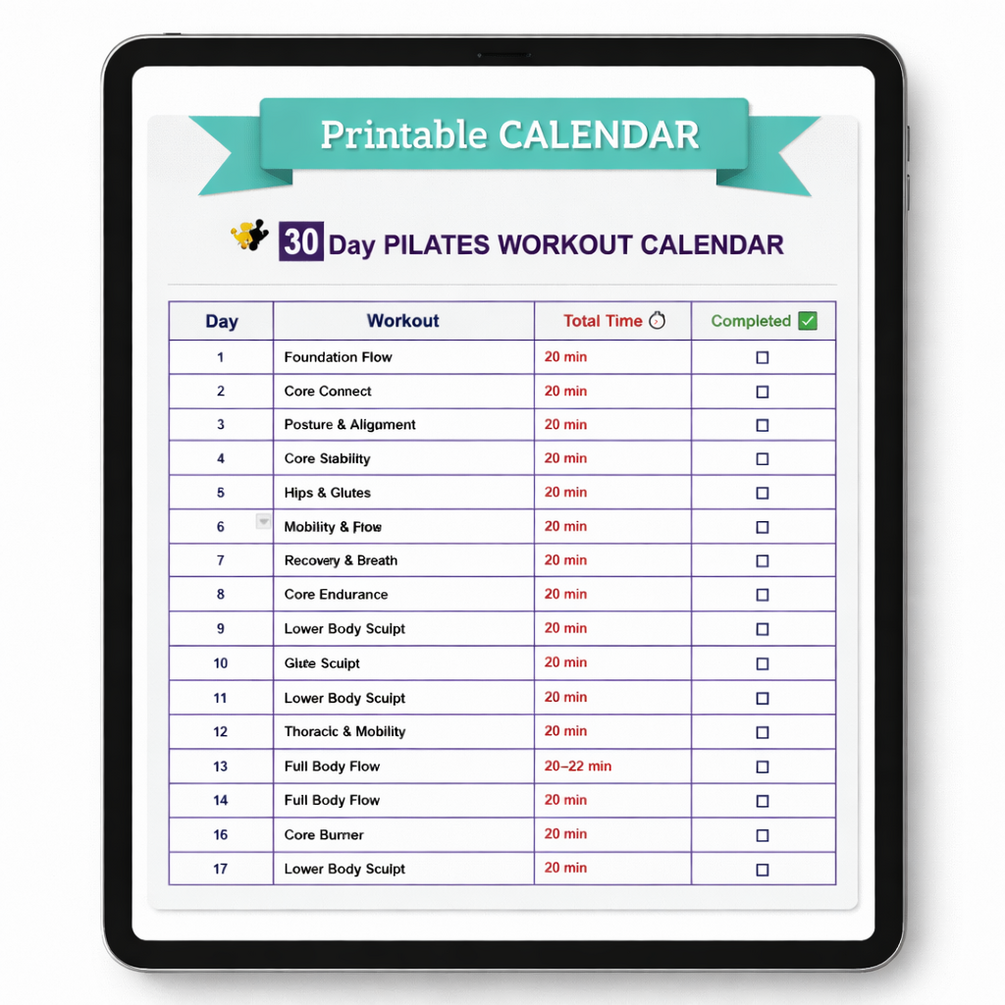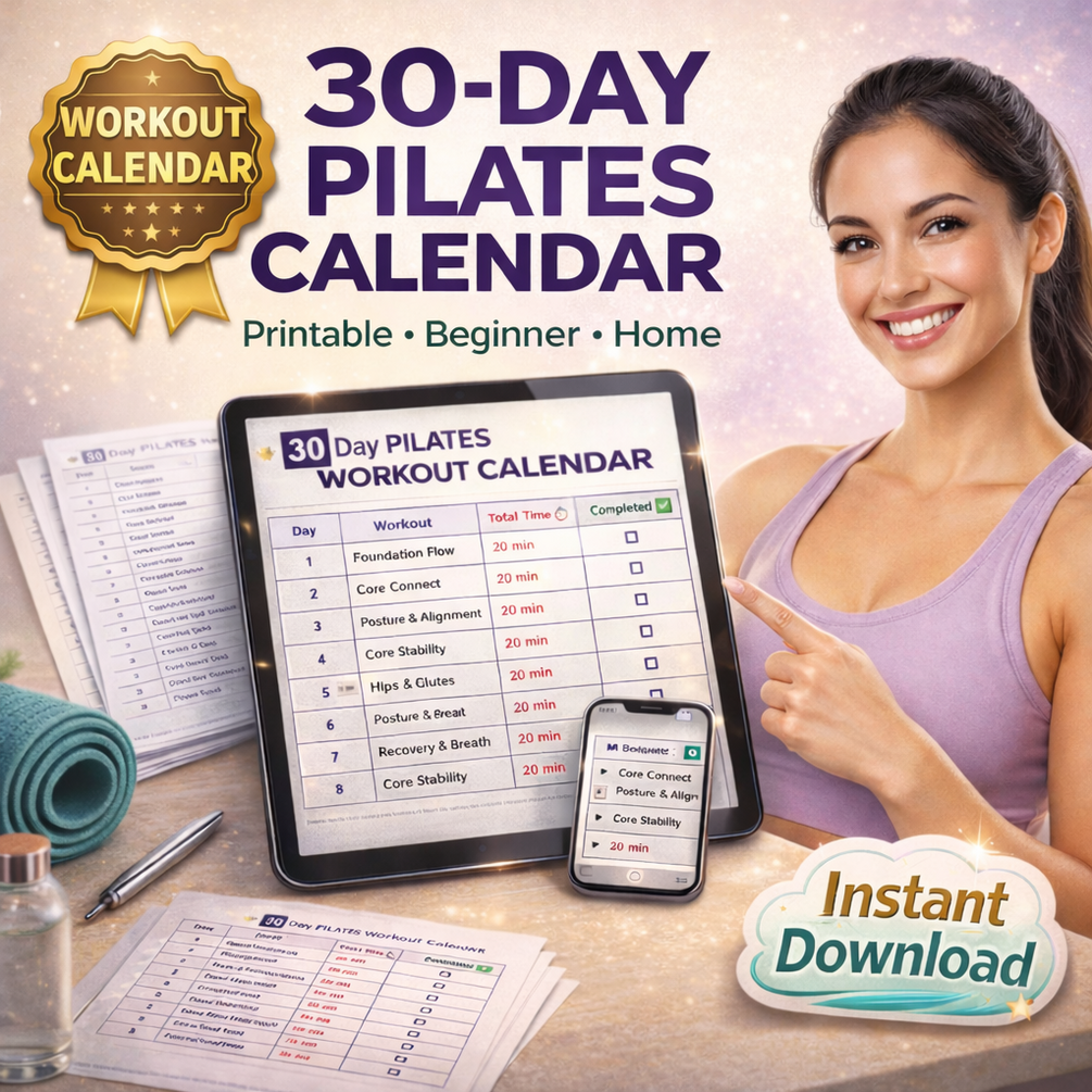 Build strength, improve posture, and stay consistent with an easy-to-follow 30-day Pilates calendar designed for beginners and busy schedules.