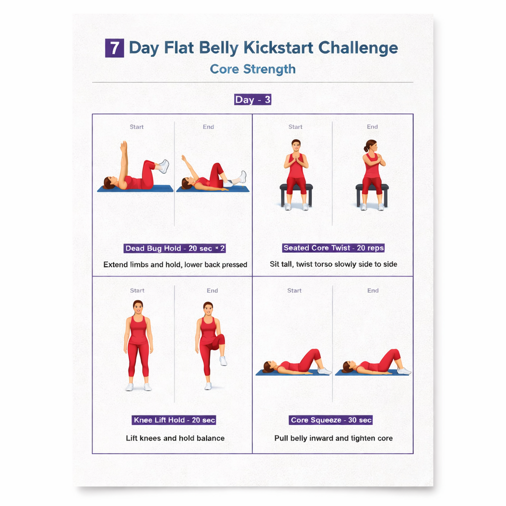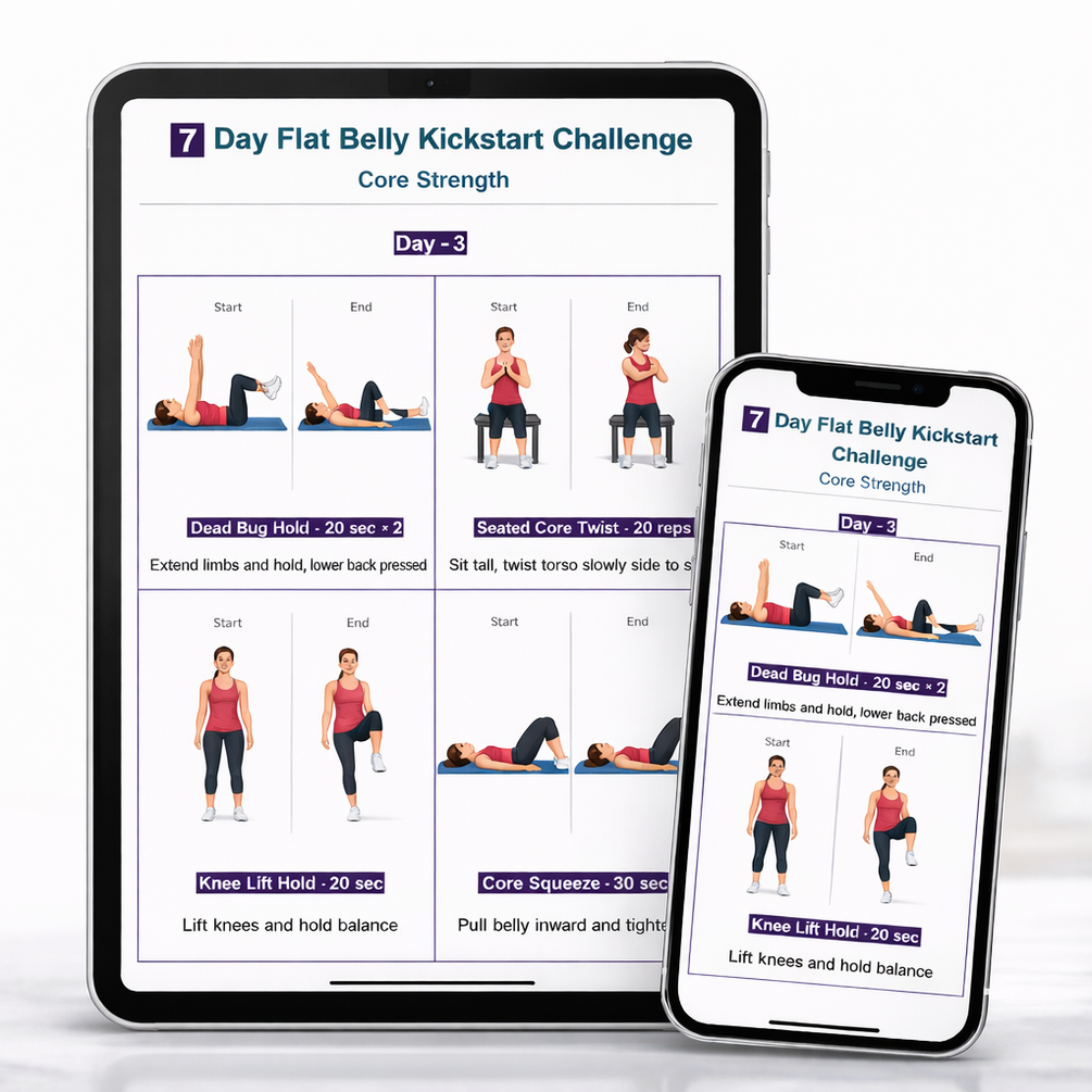 The 7 Day Belly Fat Kickstart Challenge is a beginner-friendly, home workout program designed to help you restart fat loss, reduce belly bloating, and build a strong core using short, controlled daily workouts.