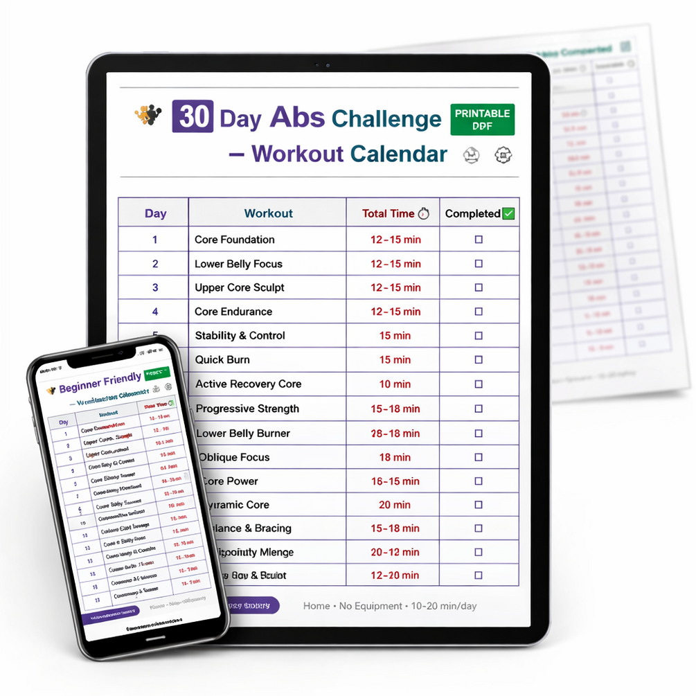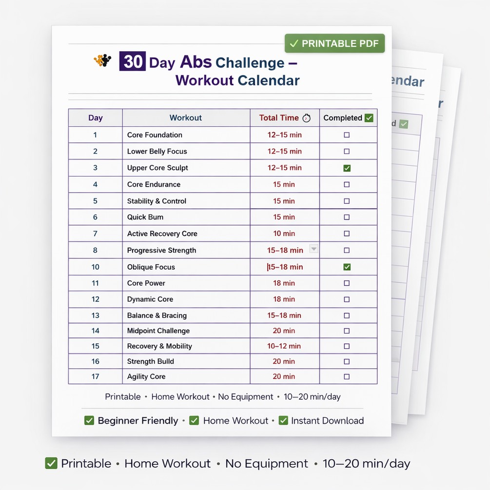 The 30 Day Abs Workout Calendar is a clean, printable workout schedule designed to help you stay consistent and organized during your abs training.